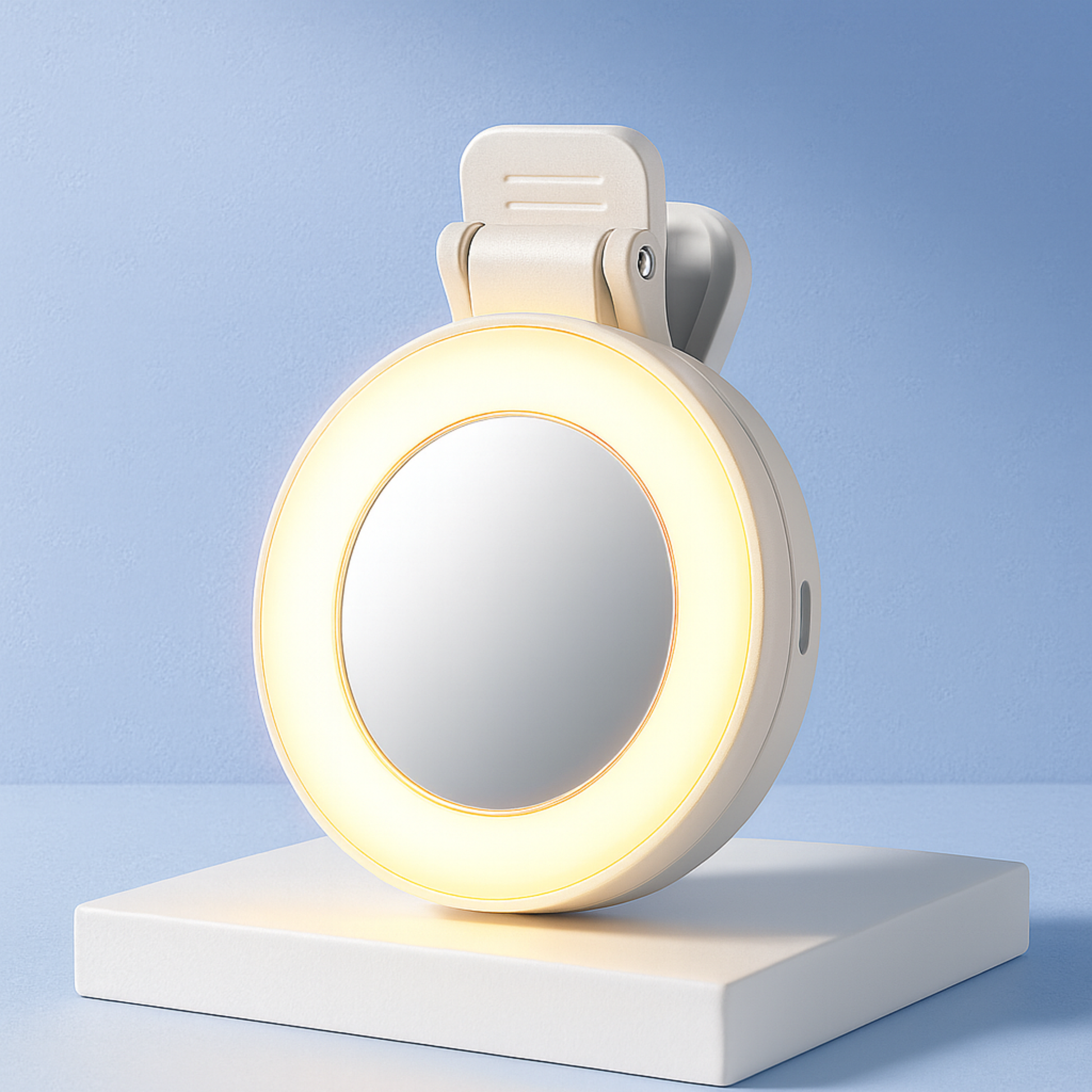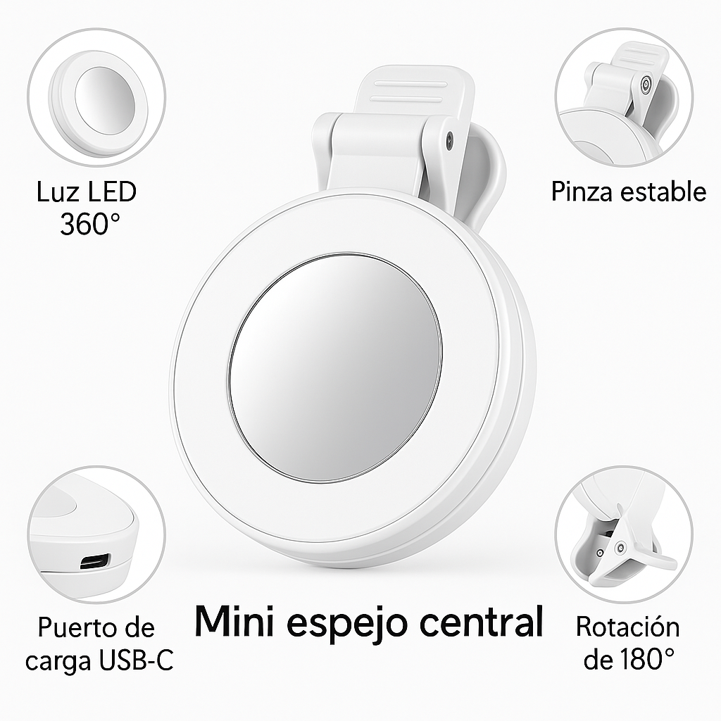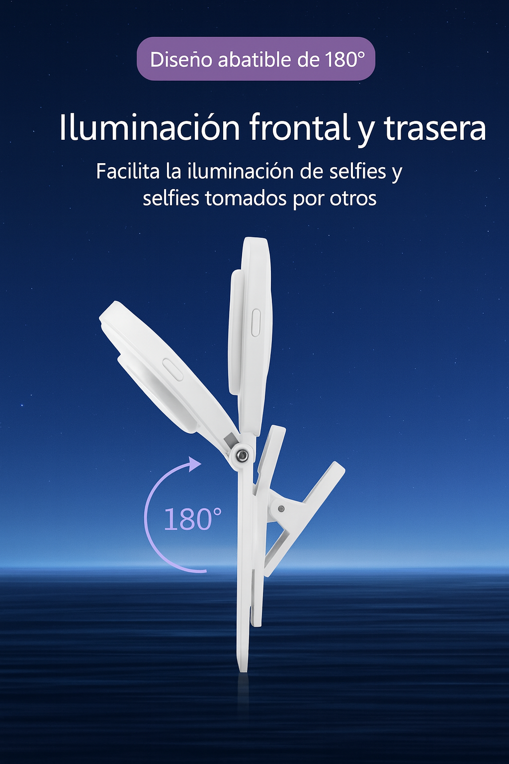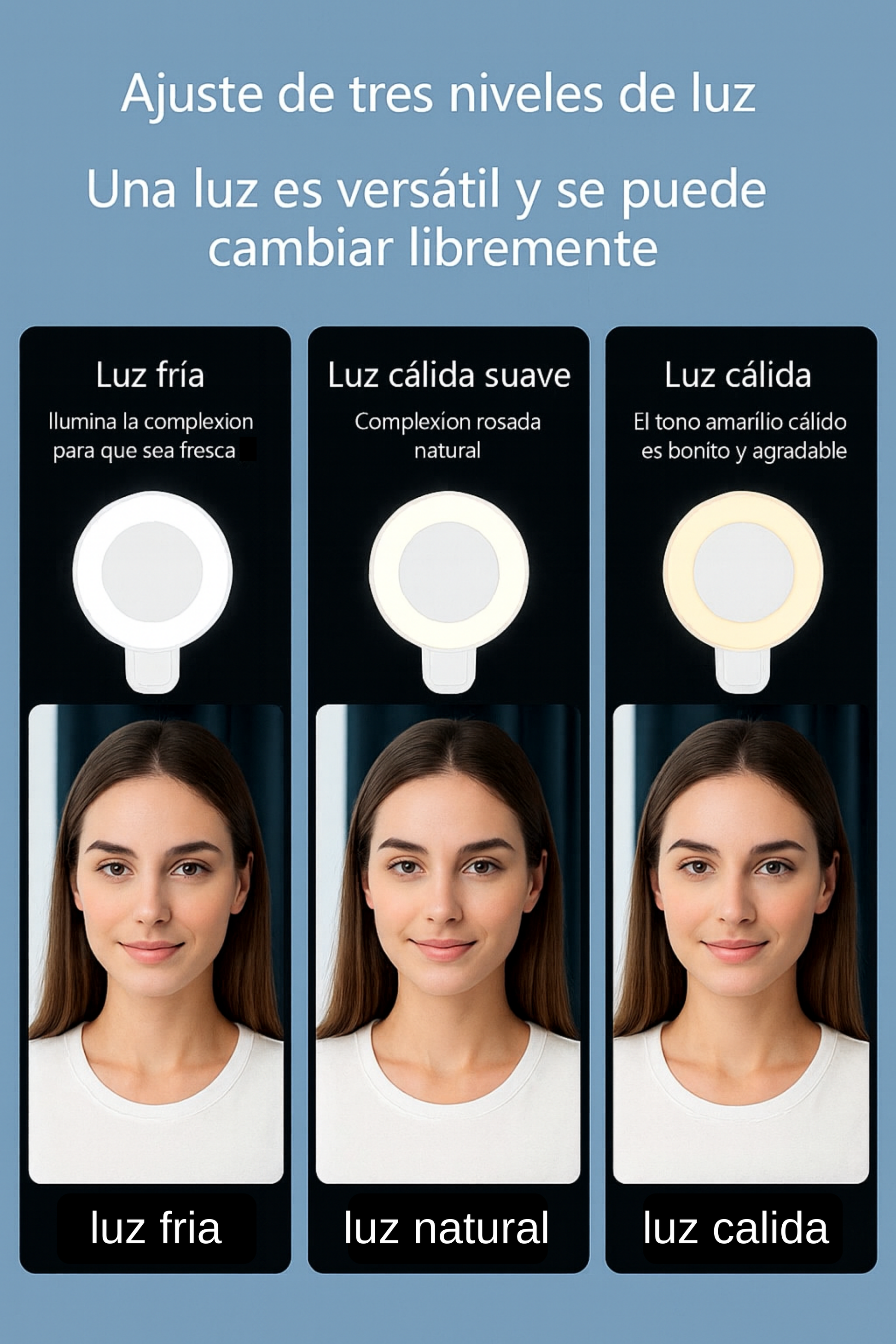 Ilumina tus selfies, streams y looks al instante. Aro LED portátil con espejo HD y soporte para smartphone; 3 temperaturas (cálido, natural y frío) y brillo regulable 10–100%. Ligero y recargable: perfecto para maquillaje, videollamadas y contenido en movimiento.